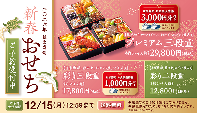 「プレミアム三段重」と「彩り三段重」には、なんと「はま寿司お食事優待券」がついてきます。