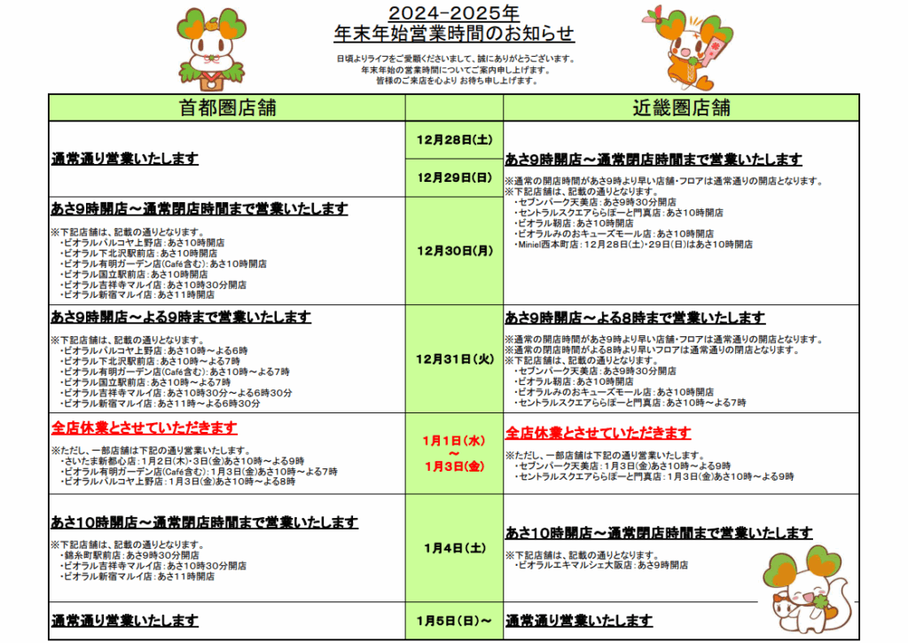 【過去】ライフの2024-2025年末年始の営業時間と休業日