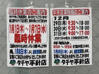 タチヤ平針店の2023-2024年末年始の営業時間です。